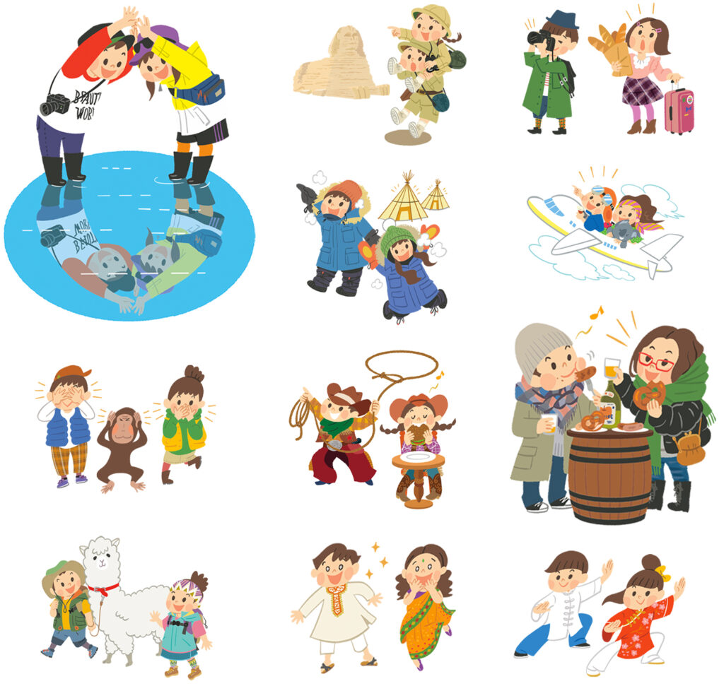 小学校高学年用、毎月自宅で5教科を復習できる家庭学習用教材です。毎年表紙のテーマが変わり、今年度は「世界旅行」ということで、男の子と女の子が旅行先で世界を体験しているカットを描かせていただきました。
