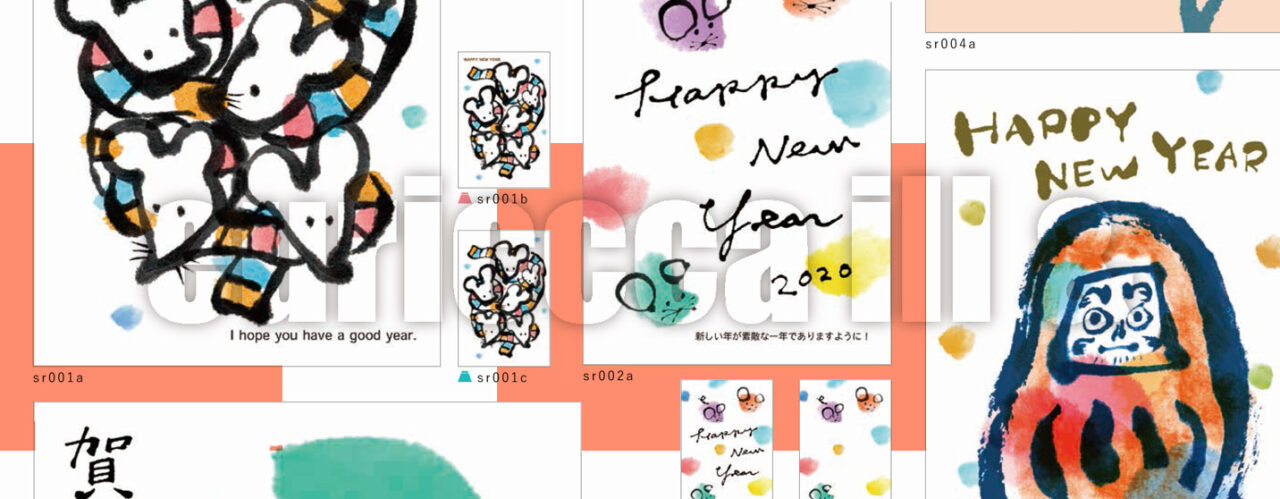 技術評論社さまから毎年発刊される年賀状素材集。ご希望のテイストやイメージの指示があり、ご依頼に沿って制作しています。筆タッチを求められることが多く、爽やか・シンプル系のタッチで制作させていただいています。ありがたいことに例年制作に参加させていただいています。