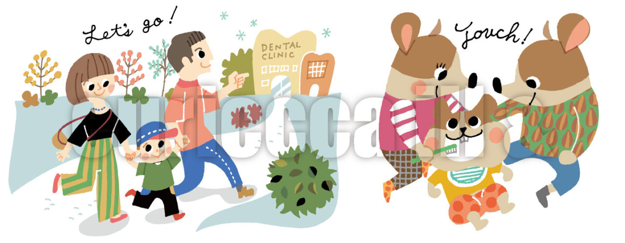 年齢に合わせた動物が決まっており、可愛く楽しい冊子になりそうだったのでイラストもポップにしました。動物なので、表情での表現ではなく「小さい子どもと親」という微笑ましい雰囲気が出るようにシーンやファッションを工夫しました。