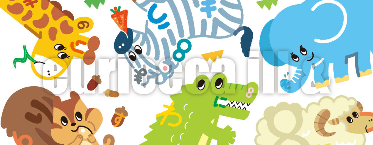 就学前の幼児を対象にした家庭用学習教材の表紙イラストを描かせていただきました。3・4歳児向けの「あかドリ」5・6歳向けの「あおドリ」があります。打合せ段階で1年間ぶんの動物が決めてあり「動物名」と「1〜9」までの数字が2つずつ隠れている、ちょっと楽しめる表紙になっています。数字はイラストによって自由に決めさせていただきました。
